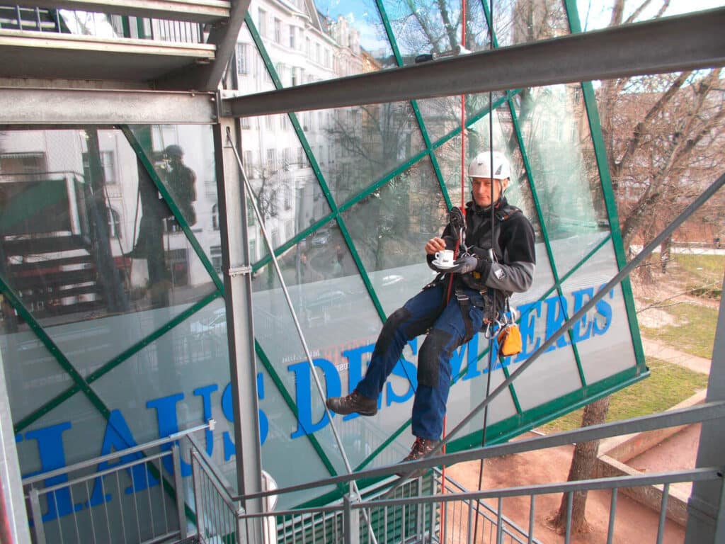Zum täglichen Berufsfeld zählen Tätigkeiten rund um Objekte aller Art, Sanierungen, Instandsetzungen, Reinigung, Taubenabwehr und vieles mehr. Bis jetzt gab es zum Glück noch keine brenzlige Situation im Zusammenhang mit der Seil-