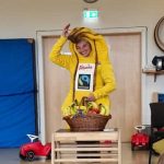 Da staunten die Kindergartenkinder der Gemeinde Warth nicht schlecht: Sie bekamen Besuch – von einer Banane. Bgm. Michaela Walla brachte ihnen im Rahmen der Fairtrade-Gemeinde fair gehandeltes und regionales Obst vorbei – stilecht im Bananen-Kostüm.