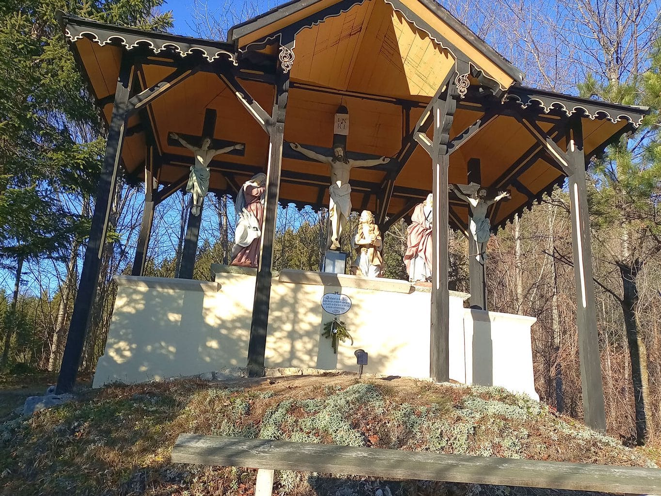Wir bleiben auf der Forststraße und am Anfang des Waldes zweigt links ein schöner Hohlweg Richtung Kalvarienberg ab. Immer der Markierung folgend, marschieren wir talwärts, bis wir schließlich auf Wegtafeln stoßen, die uns links hinunter weisen. Schräg rechts hinauf befindet sich aber schon die letzte Station des Kalvarienberges, den man unbedingt besichtigen sollte. Man kommt quasi von der Hinterseite und folgt dann den Stationen bergab.