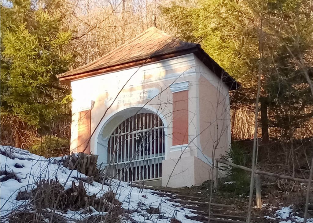 Anfangs folgen wir ein kurzes Stück der Asphaltstraße, doch bald steht linker Hand eine Kapelle und rechts entdecken wir gelbe Wegtafeln. Hier führt ein schmaler Steig am Wasserreservoir vorbei bergauf. Diesem folgen wir und erreichen schon bald wieder die Asphaltstraße, die wir aber links liegen lassen und uns Richtung Schranken wenden. Hier steht eine Holztafel mit der Aufschrift „Waldesruh“. Diesem gemütlichen und naturnahen Pfad folgen wir in den sogenannten „Kirchgraben“ hinein. Rechts unter uns fließt ein Bächlein, beim Bergaufwandern können wir sogar zwei kleine Wasserfälle entdecken. Diese erscheinen vor allem im Winter, wenn sie teilweise gefroren und mit Eiszapfen versehen sind, besonders idyllisch. Schließlich kommen wir an einem Gehöft vorbei und biegen auf der Asphaltstraße zuerst nach links und bei der nächsten Kehre nach rechts hinauf ab. Bald darauf gelangen wir wieder zu einer Rechtskurve. Hier verlassen wir den Forstweg und biegen links auf einen relativ steilen Steig ab.