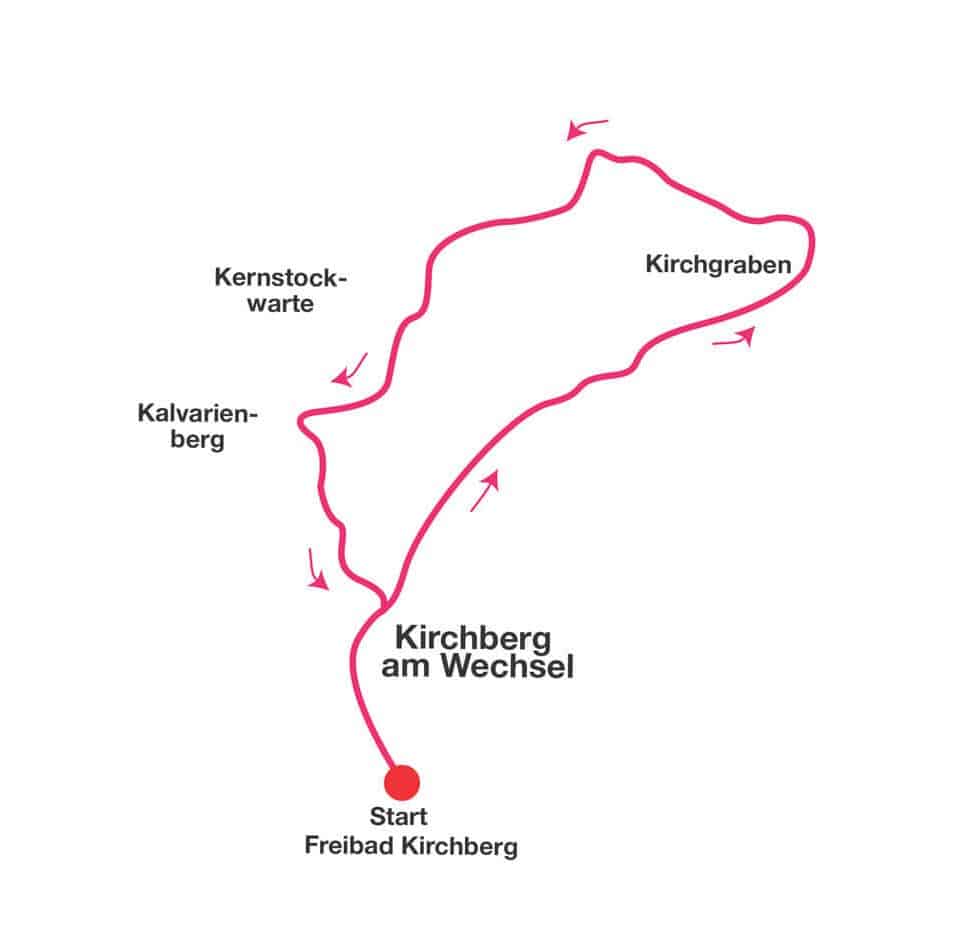 Auf der Straße angekommen, können wir nun bei Tisch und Bankerl eine Rast einlegen und den Blick auf Kirchberg genießen. Dann folgen wir nicht der Straße, sondern einem Waldpfad links hinunter. Das ist quasi die schönere Alternative. Schließlich erreichen wir wieder die erste Kehre, bei der wir zuvor rechts zur Waldesruh abgebogen sind. Nun noch den kurzen Aufstiegssteig zurück und schon sind wir wieder bei unserem Fahrzeug.
