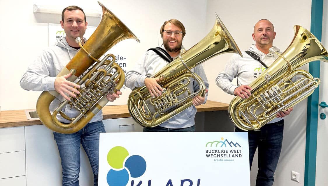 Von links: Oliver Polreich, Rainer Leitner und Bernhard Lechner sind sich nicht nur musikalisch einig; die drei Tubisten kümmern sich hauptberuflich um sämtliche Klima- und Energieprojekte der Region / Foto: Rehberger