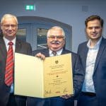 Es war ein Firmenjubiläum, wie es nicht alle Tage vorkommt: Das Wiener Neustädter Bauunternehmen Dinhobl wurde von der WKNÖ für ihr 105-jähriges Bestehen geehrt. Am Bild von links: Landesinnungsmeister Günther Lehner, Johannes Dinhobl und Bundesrat Sebastian Stark, der LH Johanna Mikl-Leitner vertrat.