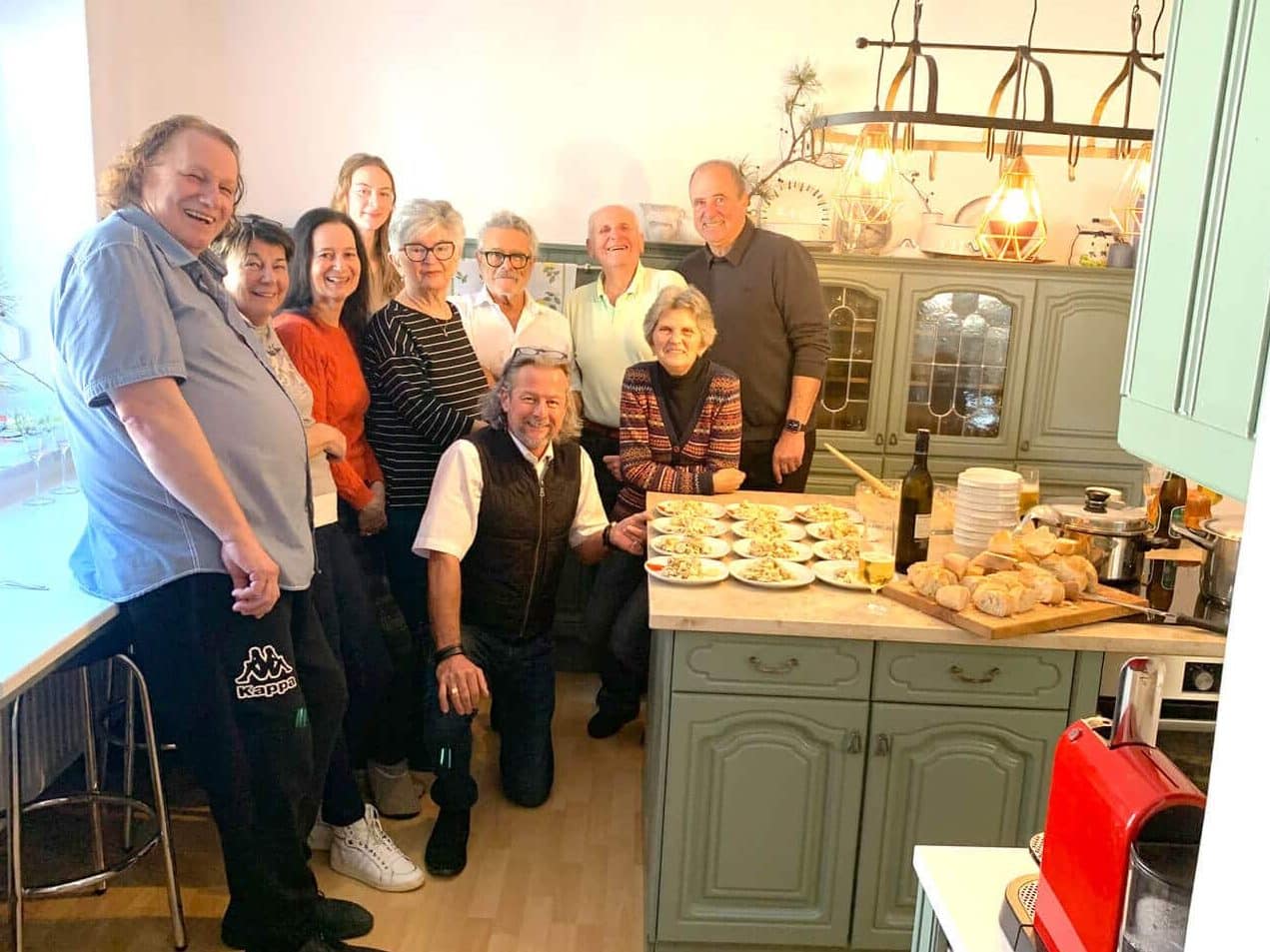 Bild links: Kramuri-Gründerin Christine Schönowitz beim Mittwochs-Kochen mit Gabriele Käfer mit Enkerl Frida, Helga Blum, Christl Jungmeister und Anna Heissenberger; Bild rechts: Gerhard Eidler, Helga Blum, Christine Schönowitz, Marlene Graggober, Ditta Pölzlbauer, José Valderas Dias, Jörg Zahornitzky, Horst Pölzlbauer, Christl Jungmeister und Alfred Füssl beim gemeinsamen Heringssalat-Zubereiten am Aschermittwoch / Fotos: Rehberger, Kramuri