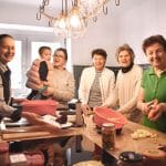 Bild links: Kramuri-Gründerin Christine Schönowitz beim Mittwochs-Kochen mit Gabriele Käfer mit Enkerl Frida, Helga Blum, Christl Jungmeister und Anna Heissenberger; Bild rechts: Gerhard Eidler, Helga Blum, Christine Schönowitz, Marlene Graggober, Ditta Pölzlbauer, José Valderas Dias, Jörg Zahornitzky, Horst Pölzlbauer, Christl Jungmeister und Alfred Füssl beim gemeinsamen Heringssalat-Zubereiten am Aschermittwoch / Fotos: Rehberger, Kramuri